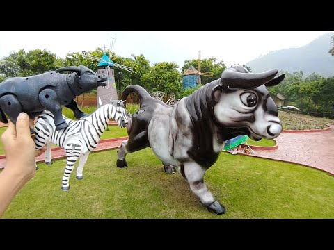 วัวพามาเที่ยวสวนน้ำอยู่กับพี่กบยักษ์รูปปั้นกลางสระและช้าง ม้า ควาย cow buffalo frog elephant horse ข...
