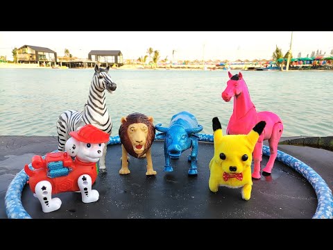 ปิกาจู สิงโต ควาย ม้า ม้าลาย มาแชล paw patrol, horse, Pikachu, zebra, lion ยืนบนแพยางริมชายหาด